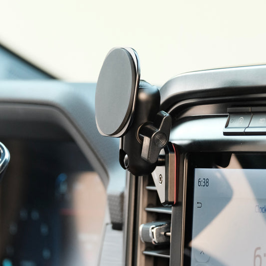 Offroam phone mounts for Ford F-150 2021-2026 position your phone perfectly without blocking the view, controls, or airflow. Shaped to fit the dashboard for secure attachment. Universal fit or MagSafe holders with strong magnets for off-roading with Qi2 wireless charging option. Simple install with patented design.